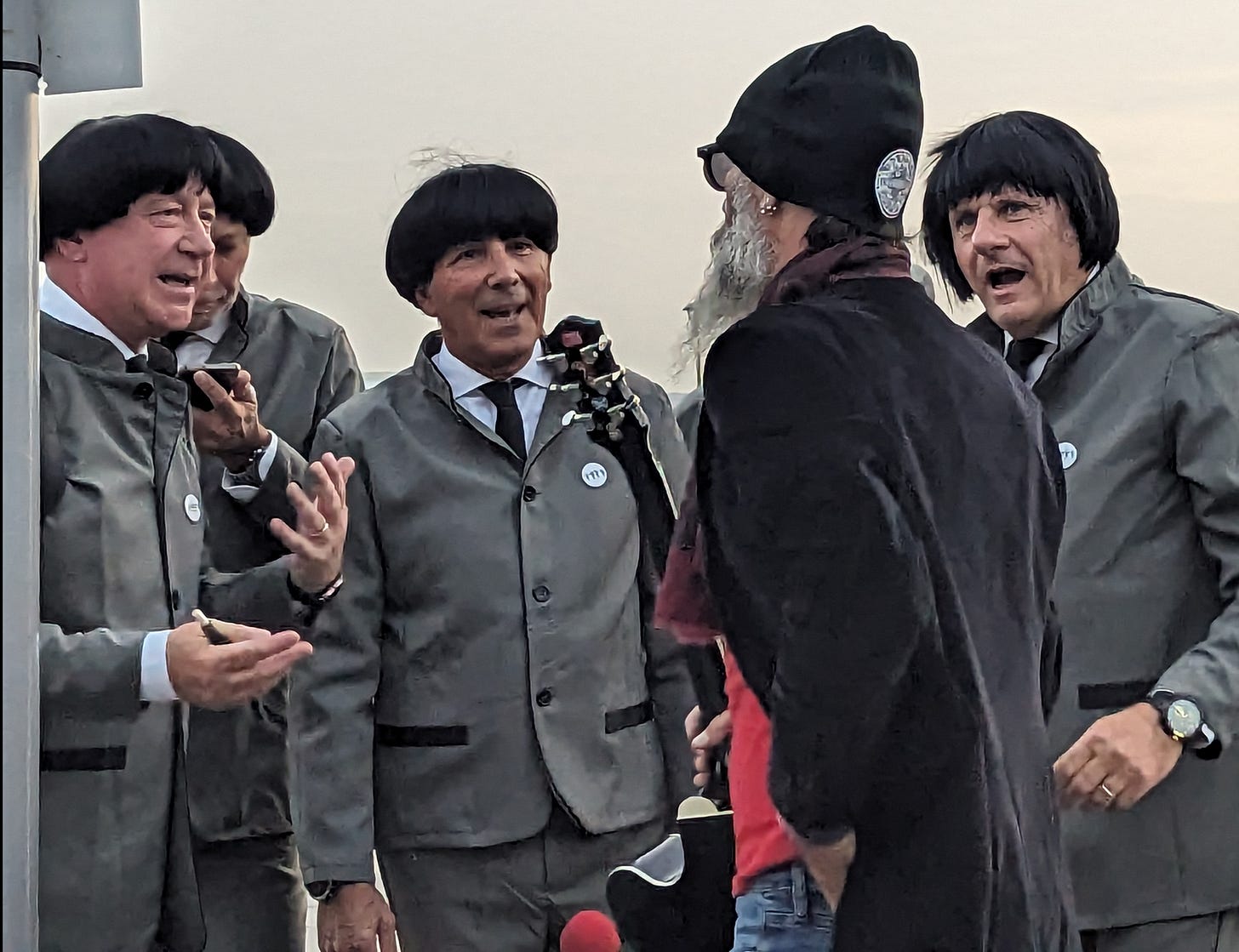Italian Beatles pilgrims talking with a street musician by the Fab Four statue, Liverpool waterfront.