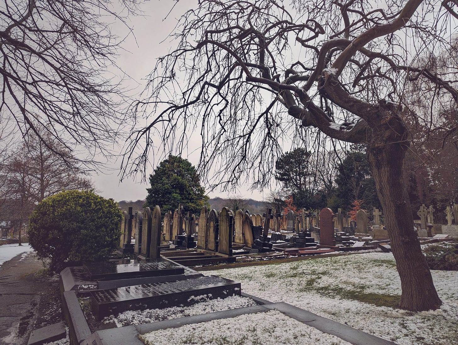 St. Peter’s churchyard on a snowy day. Eleanor Rigby’s grave is in the second row from the left. The unusual perspective here is that it rarely snows in Liverpool.