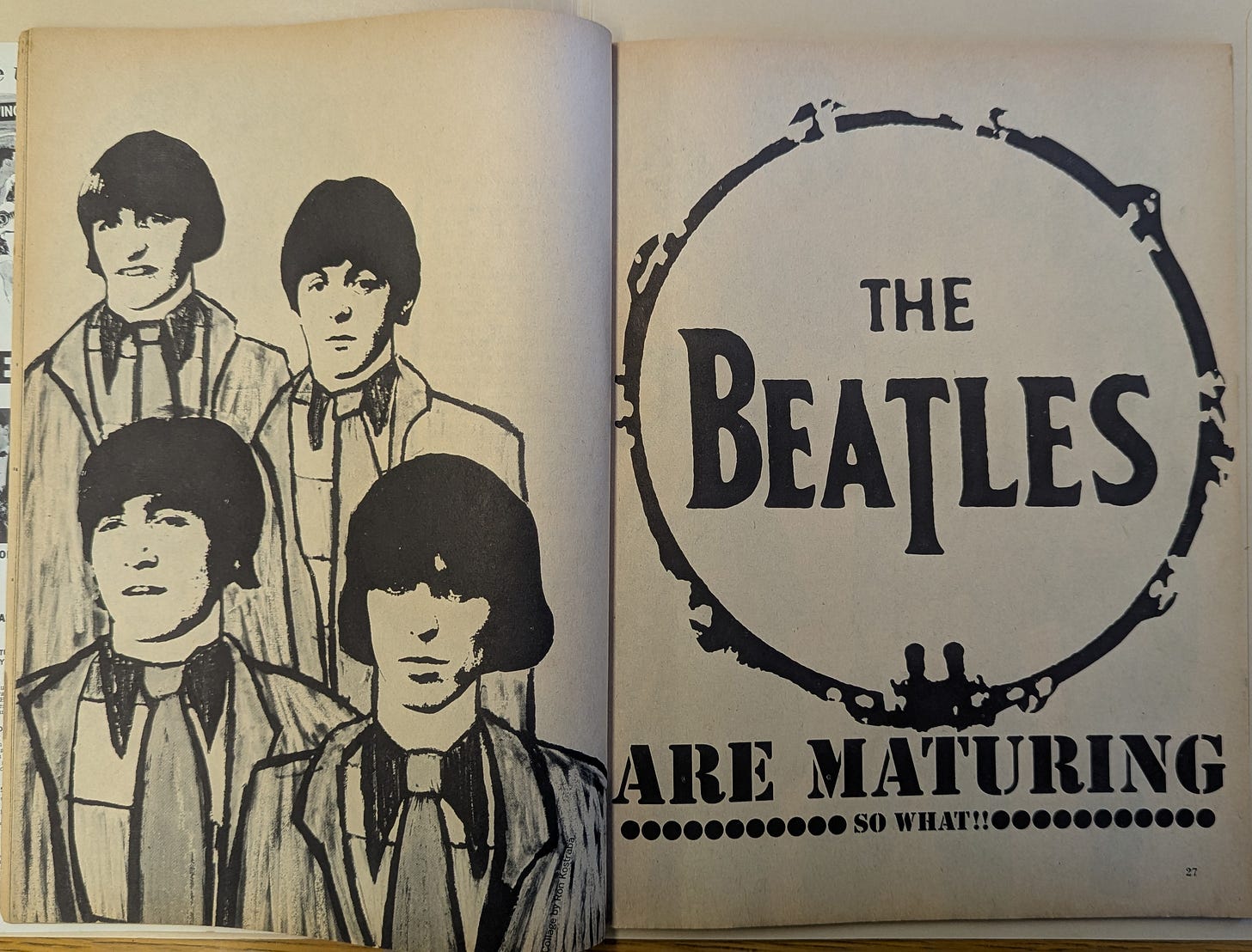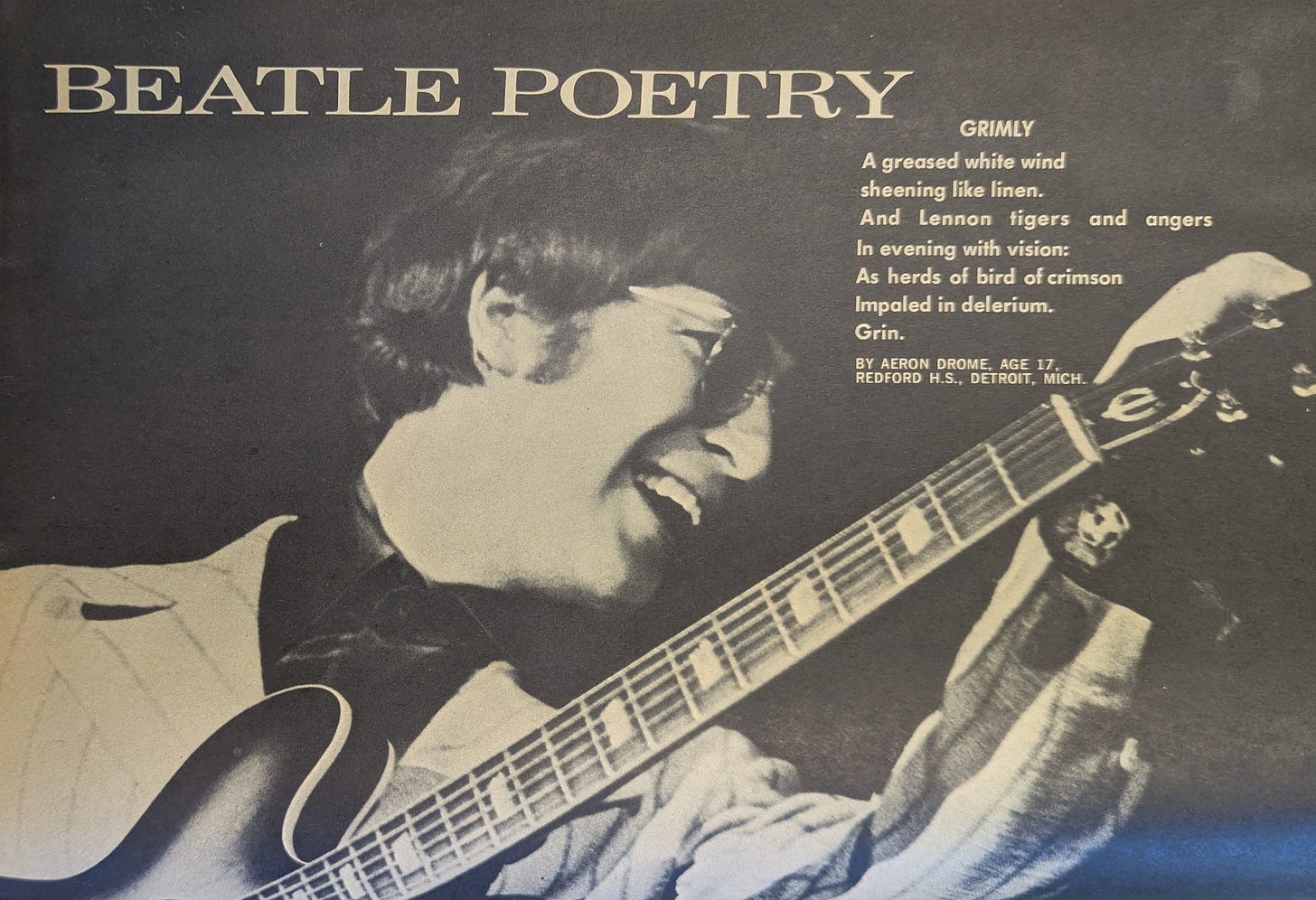 Unlike the comics, Beatle poetry in fan magazines was unusual, and even more so because the regular poetry feature seems to have been reserved exclusively for The Beatles, at least during the 1960s. The inclusion of Beatles poetry as a regular feature is also a sign of the evolution of pop music into a substantive art form inspiring other art forms, which — as we talked about in Part One of Beautiful Possibility — is what mythological stories tend to do especially well.