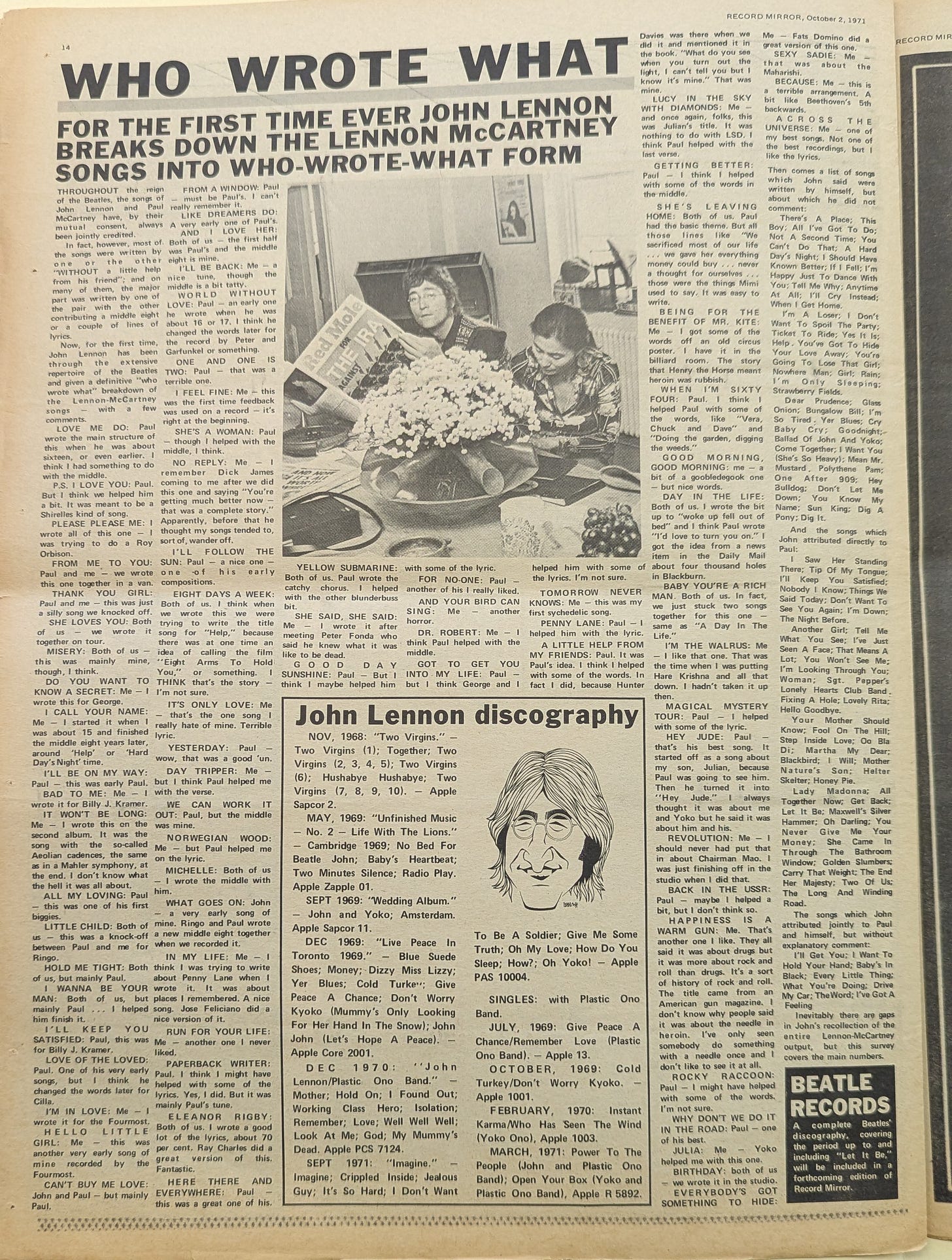 Second, notice that this article is from October 1971 — two months before John’s Rolling Stone interview and nine years before his “who wrote what” 1980 Playboy interview, both of which we talked about in Part One.