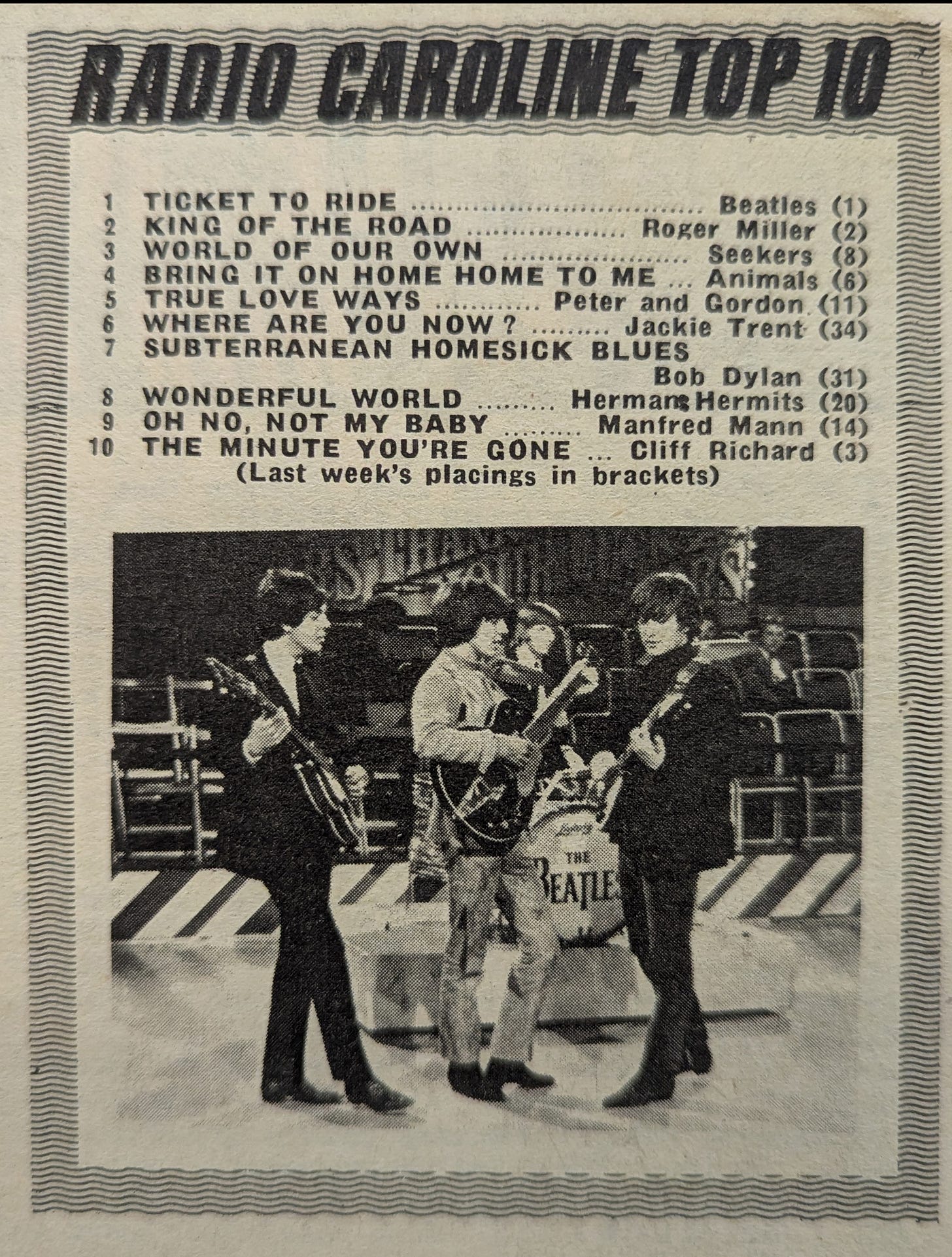 This last bit is why this listing especially caught my attention, because “Ticket to Ride” is at #1. The BBC banned “Ticket to Ride” because the line she said that living with me was bringing her down described two lovers living together outside of society’s constraints. I find it deliciously seditious — a pirate radio station advertising a #1 Beatles song banned by the BBC in an advertisement in a mainstream London newspaper. This is the sort of thing that — over and above The Beatles/John and Paul themselves — makes me love this story so much.