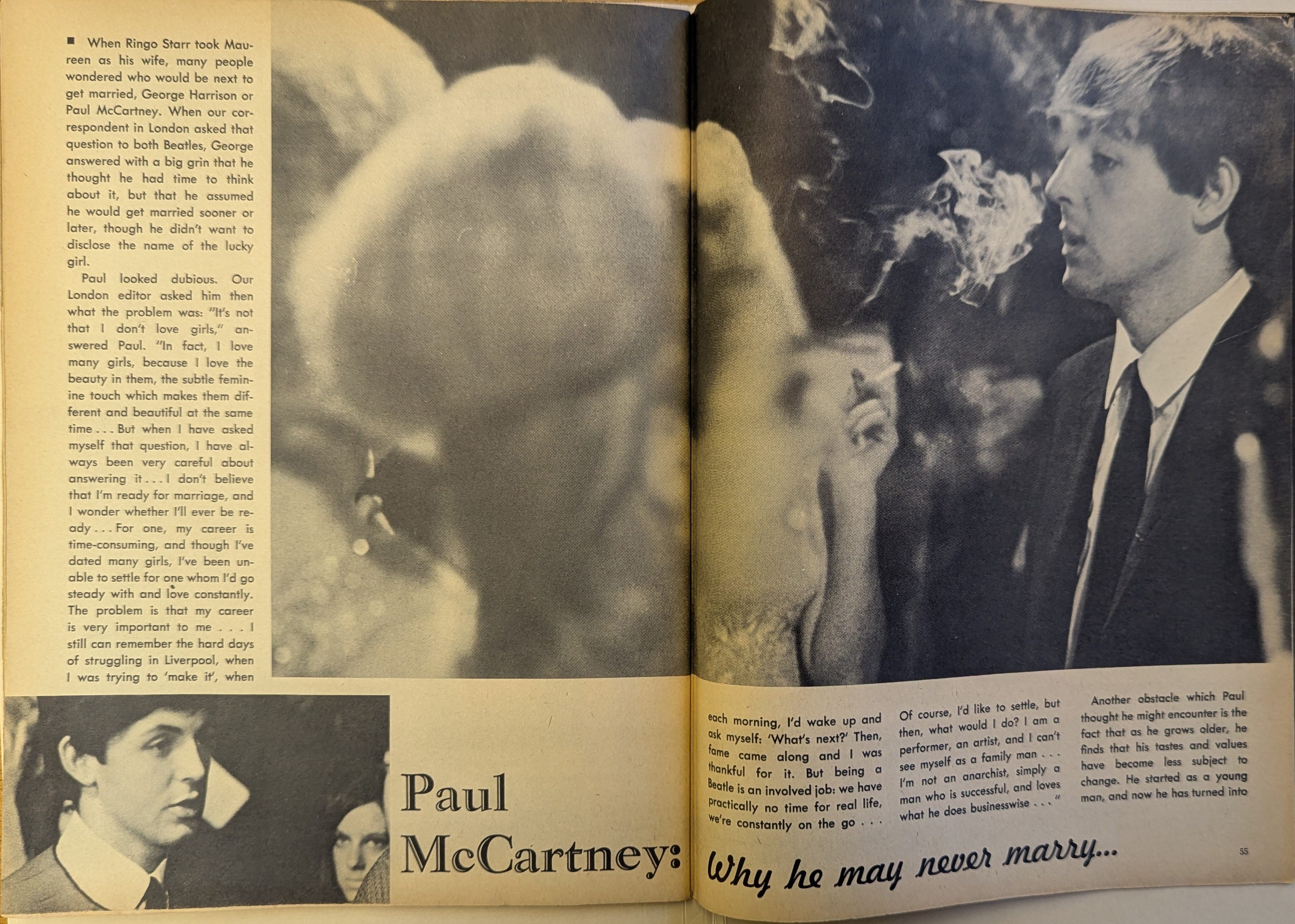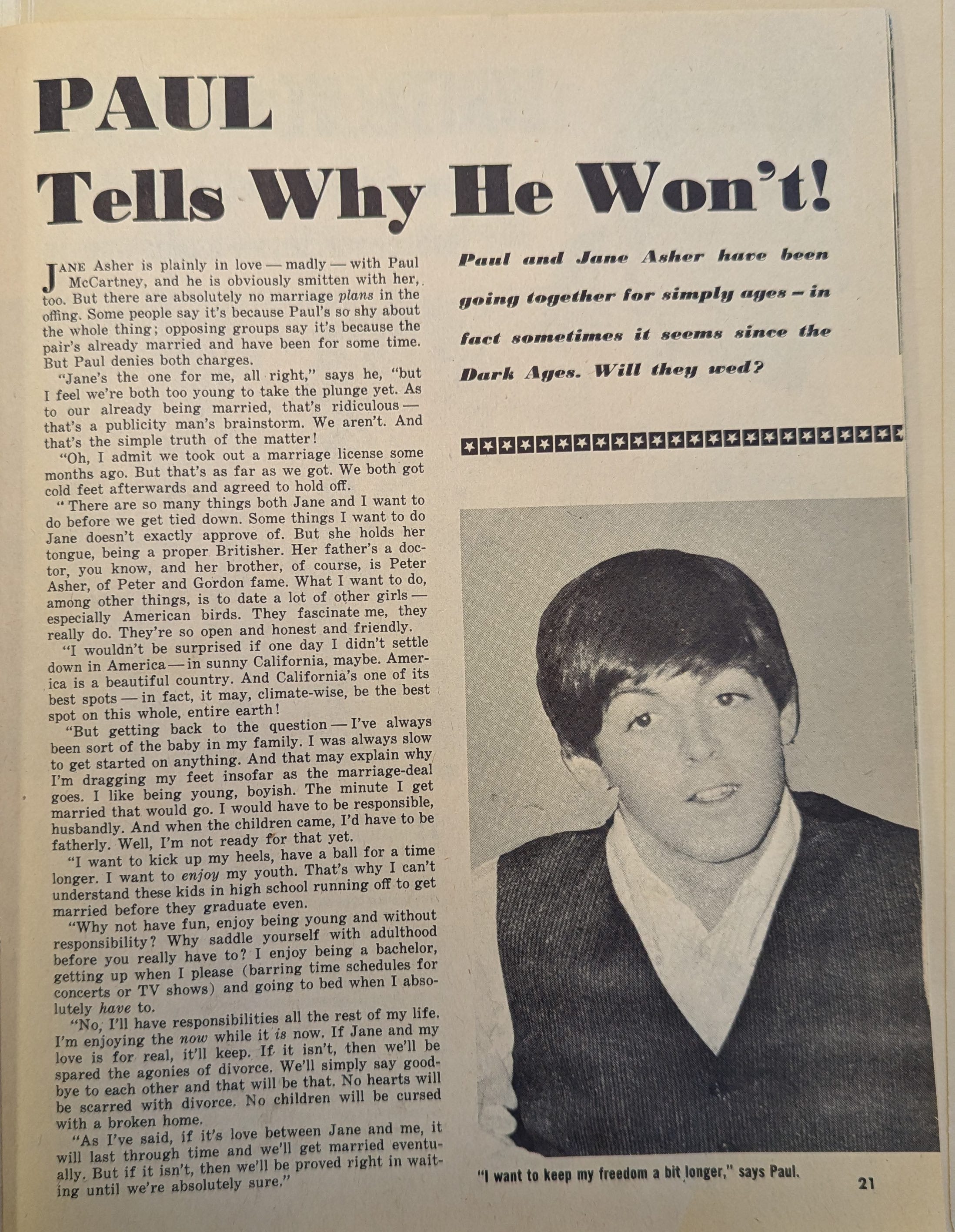 The archive contained a significant number of articles in magazines of the time that speculated on Paul’s not yet having married Jane Asher, and his stated reluctance to marry in general. Here are a couple—