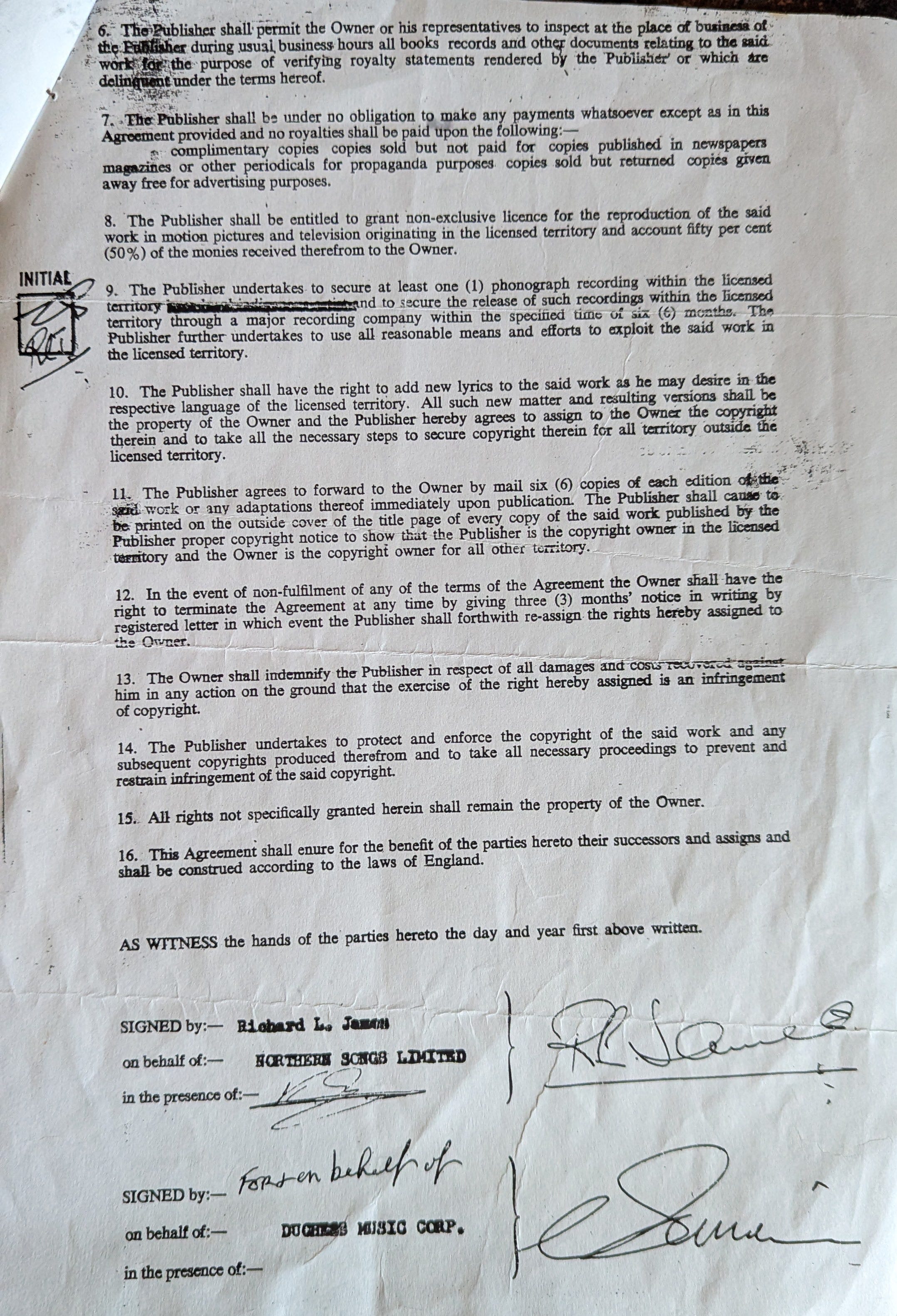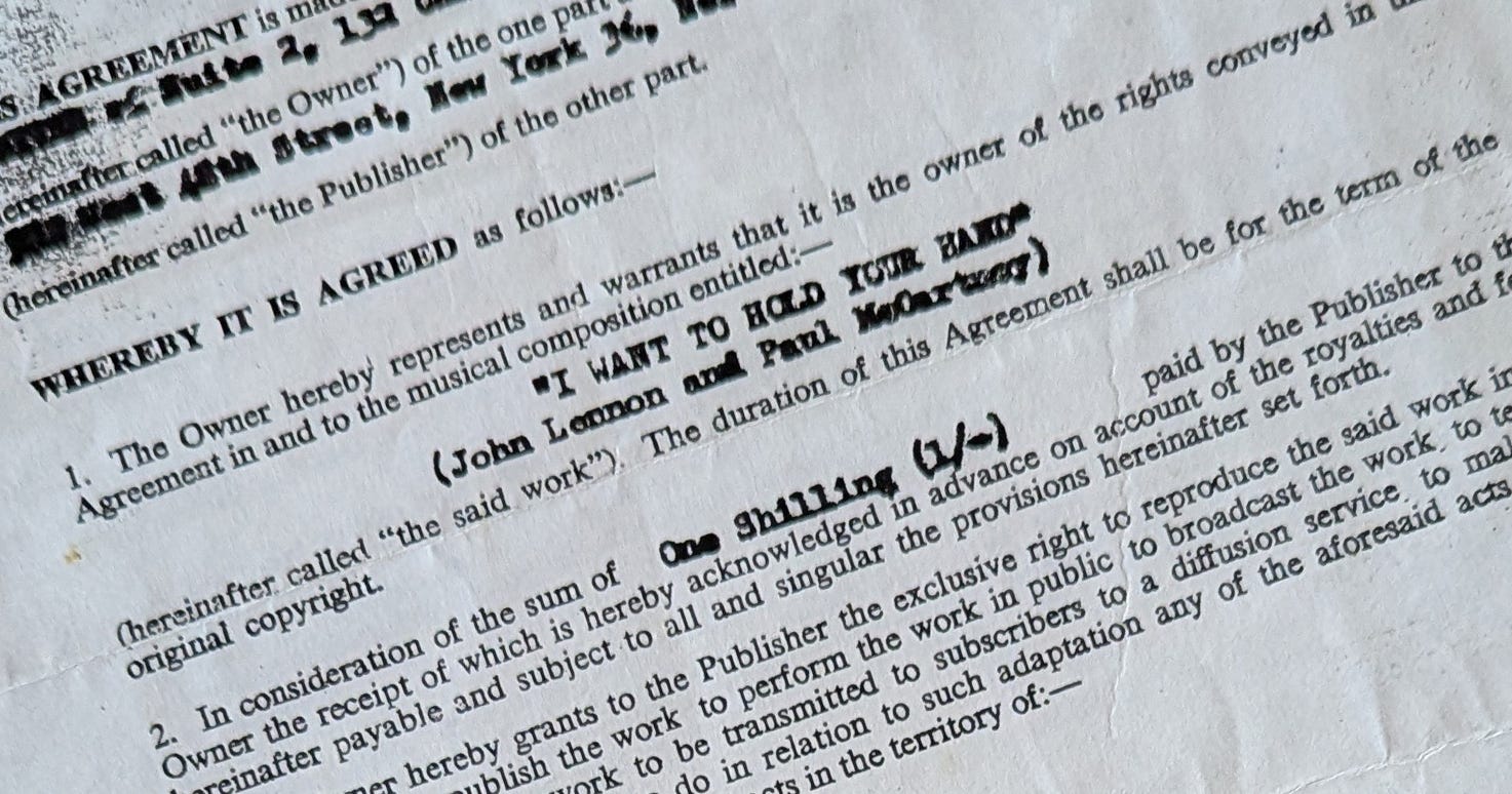 A few months ago when last I was in London, I came into possession of what I’m told is the only copy in existence of the agreement assigning US/Canadian publishing rights for “I Want To Hold Your Hand” to Duchess Music, for the price of one shilling (that’s about a quarter, I think, in 1964).